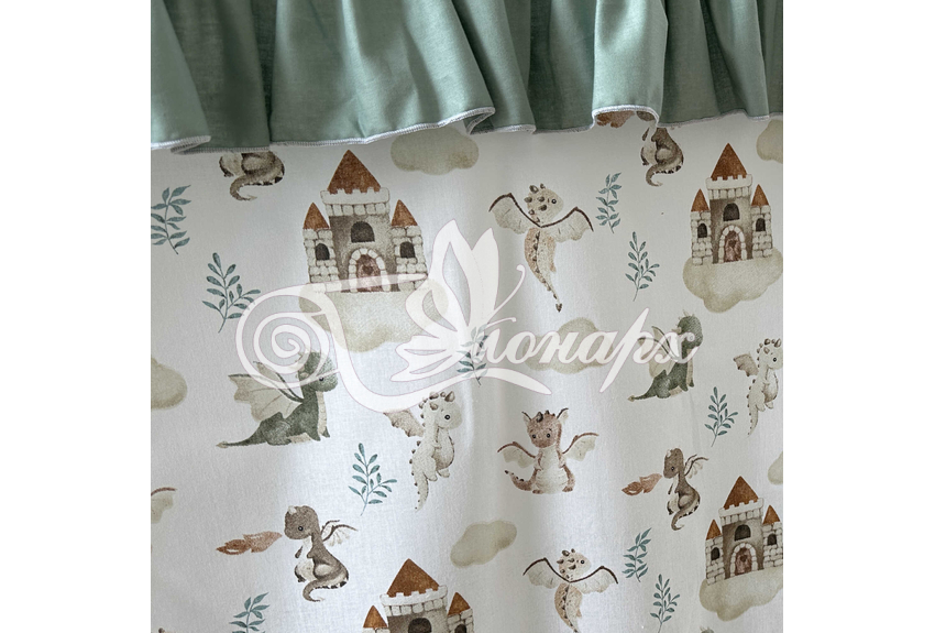 ширина - 137 см + 24 см на рюши (по 12 см на одну сторону). - Занавески с завязками (по 4 завязки на каждой занавеске) на переднюю сторону кроватки 2 шт.: